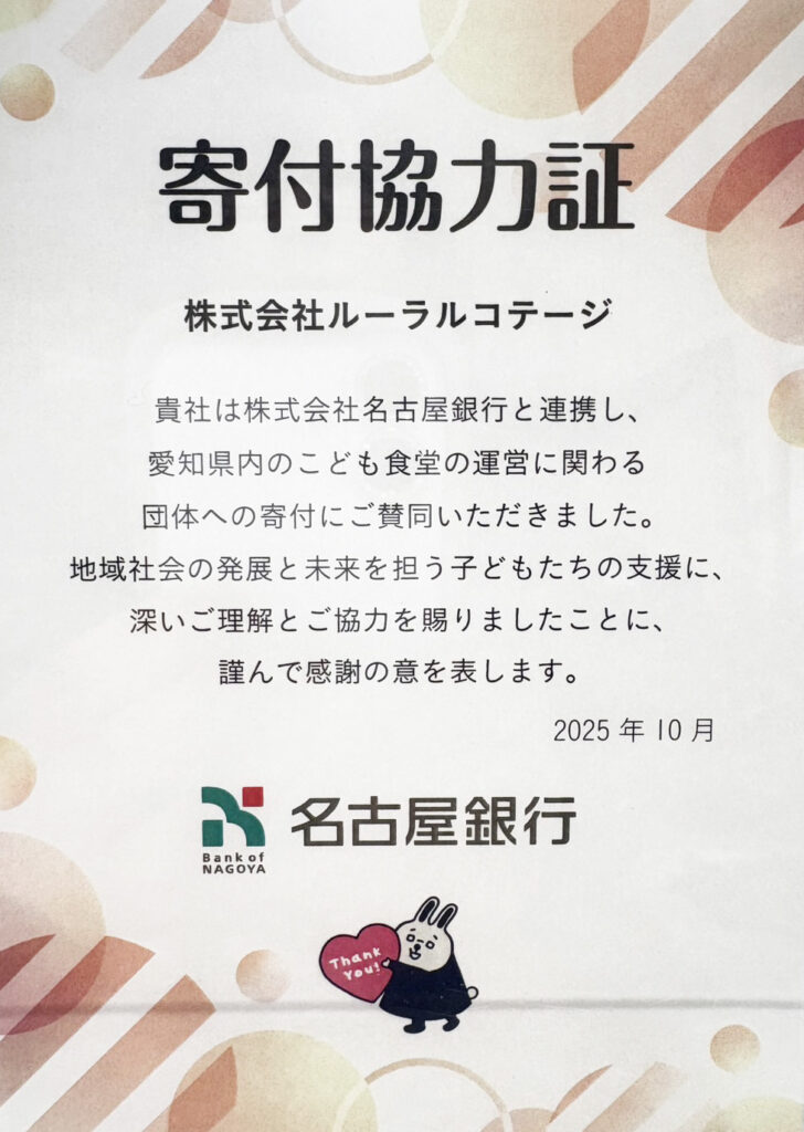 このたびルーラルコテージは、愛知県内にてこども食堂の運営支援を行う団体へ寄付をいたしました。