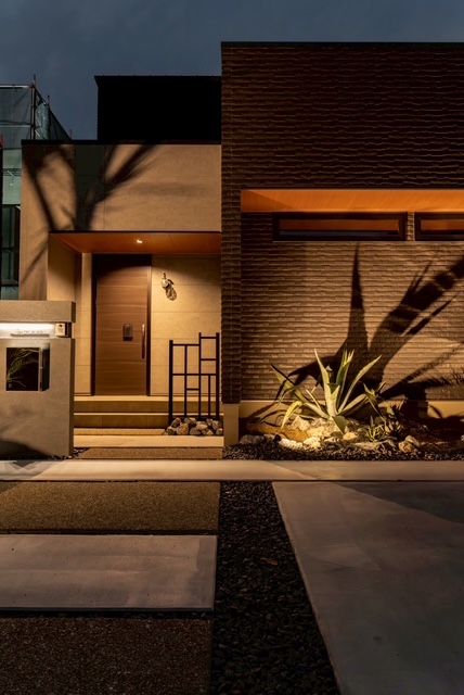 🔳植栽の影を楽しめるよう、アップライトを両サイドに配置することで、夜の外観が優しい雰囲気になりました。