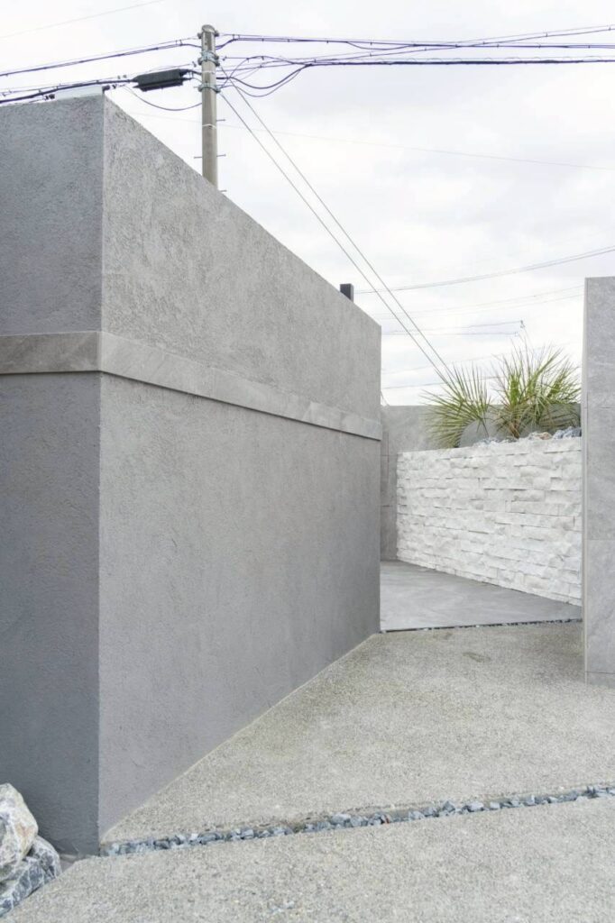 道路側からの目線は、壁や高さのある構造でコントロール。ただ隠すのではなく、素材感や配置に工夫を加えることで、圧迫感のない落ち着いた印象に仕上げています。