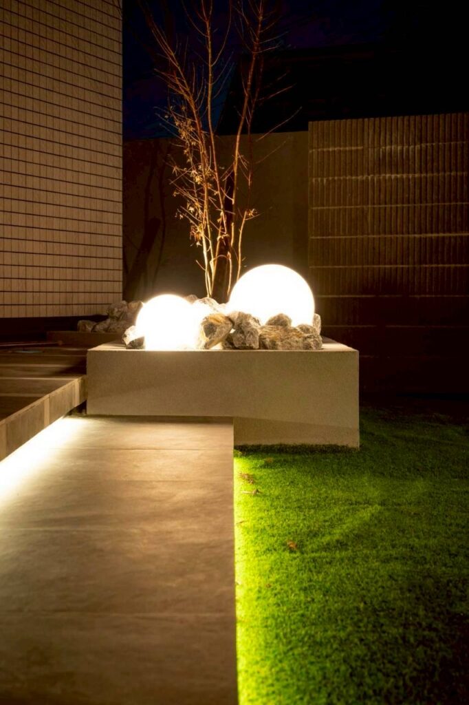 夜になると、階段の蹴込み部分に仕込んだライン照明やスポットライトが点灯し、壁やロックに陰影や、植栽のシルエットが浮かび上がったりとまるでホテルのテラスのような落ち着いた空間に変わります。