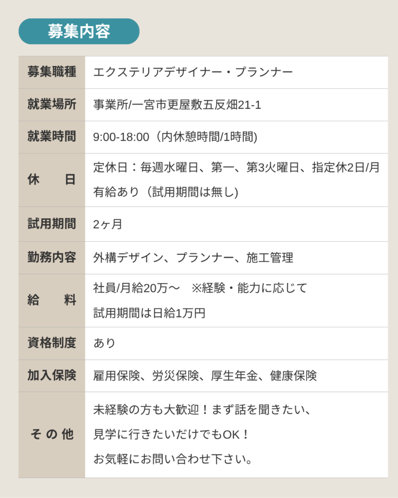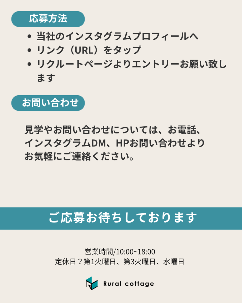 4月 16, 2026 一緒にお仕事をして頂ける仲間を募集しています ルーラルコテージでは、柔軟な発想とご提案力でお客様に外構デザインをご提案できるプランナーを 募集しております。 地域に根ざした外構・お庭づくりを一緒に楽しんでみませんか?